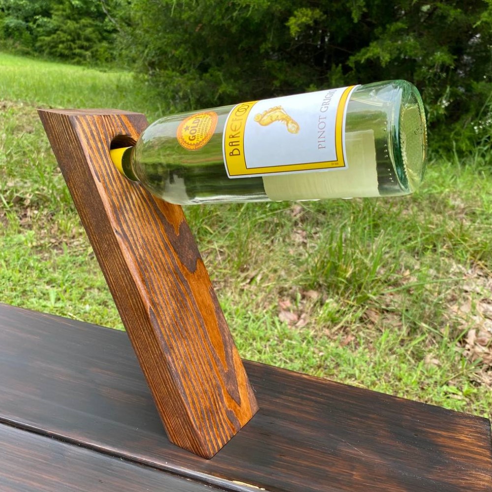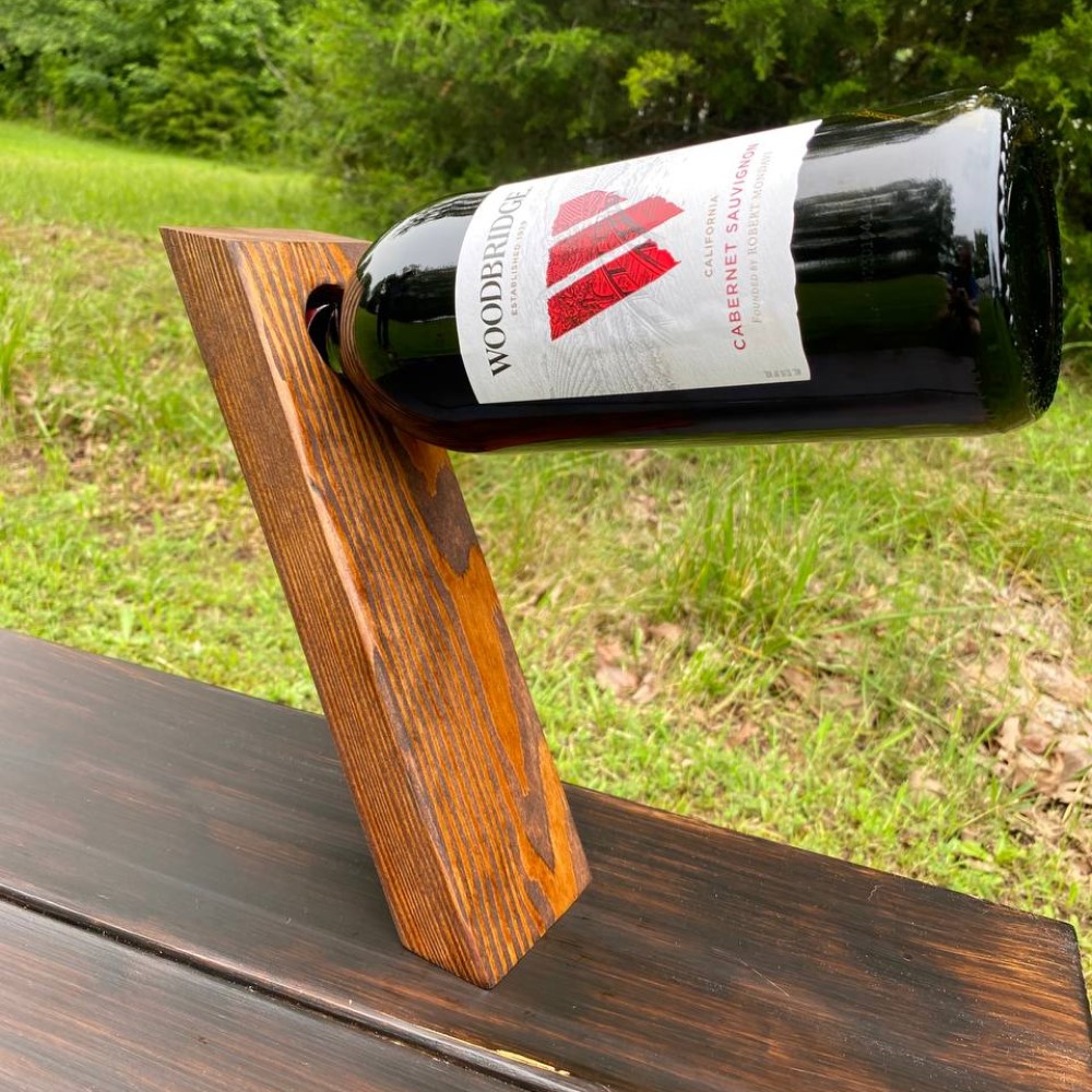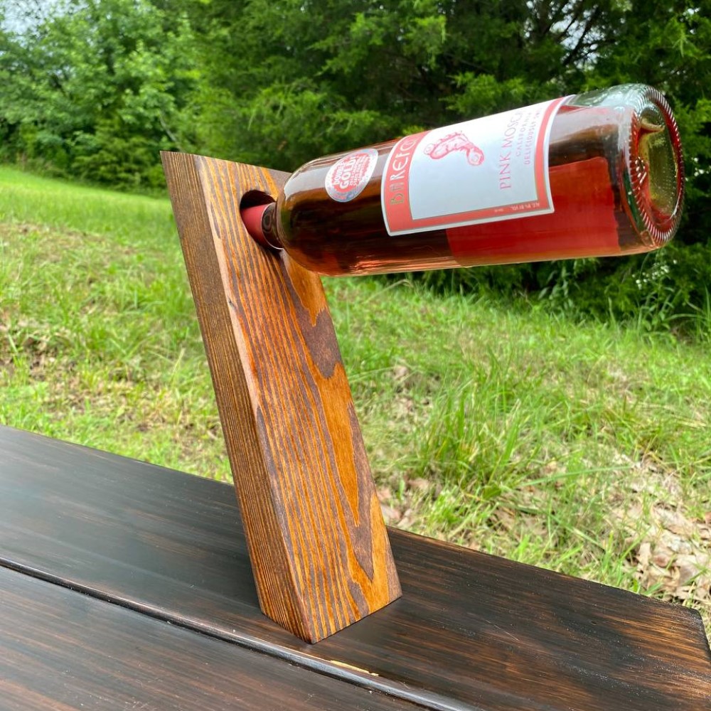 A handcrafted floating wine bottle holder made from solid pine and finished in your choice of stain. Fits both 750ml and 1.5L bottles. A standout gift for wine lovers and a rustic decor favorite.