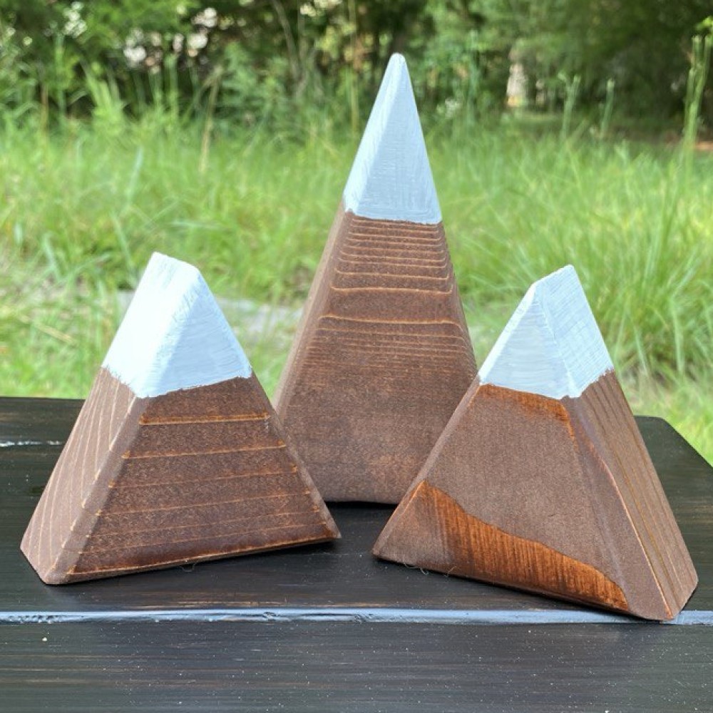 Bring a touch of the outdoors to your space with this handcrafted 3-piece wooden mountain set. Choose from brown or blue finishes, each hand-painted with snow caps and sealed for lasting charm.
